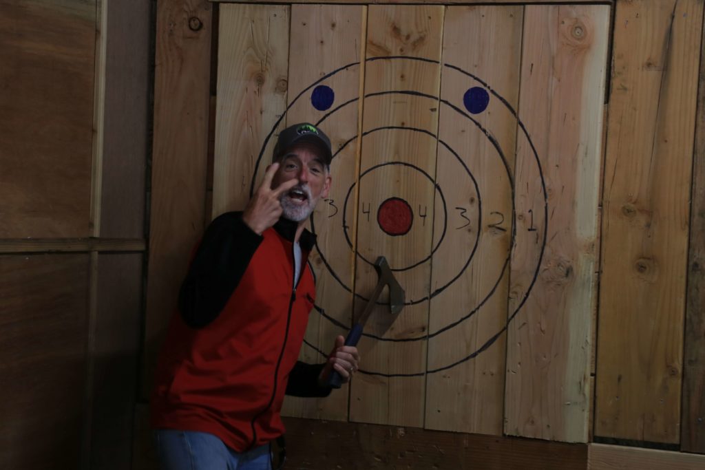 Quickly we learned that good throwing came down to rotation of the axe, consistency of throwing speed and then finding just the right distance to throw from. My first throw did exactly what I thought it would by bouncing off the target and hitting the floor. Anthony evaluated my form and suggested an adjustment. As the axe left my hand on the second throw it felt smooth and it was if the axe was sailing in slow motion as I watched the rotation of the axe-head while it headed for the target. What I’d like to tell you is that I planted the sharp end of the axe head into the bullseye, but I did not. However, it did stick into the wood on just my second throw. It was genuinely exciting and needless to say I was feeling pretty proud.